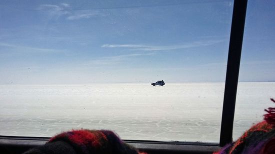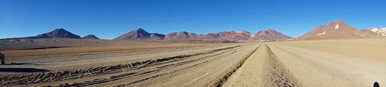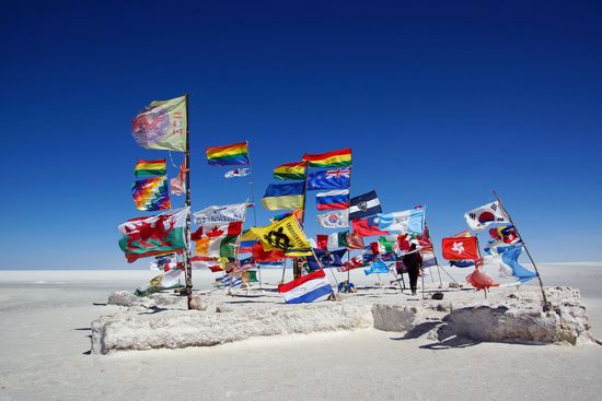 Wir fahren anschließend auf den Salzsee drauf Richtung Salzhotel. Wir schauen alle aus dem Fester, es gibt nur zwei Farben zu sehen, das Weiß des zu dieser Jahreszeit trockenen Salzsees auf dem wir fahren und das tiefe Blau des Himmels. Wir haben alle Sonnenbrille auf, denn es ist sehr grell. Links und rechts in einiger Entfernung fahren andere Geländewagen. Unweit des Salzhotels machen wir an dem Dakar Monument(?) halt, schießen uns gegenseitig ein paar Fotos und gehen Richtung Hotel. Davor sind einige Fahnen aufgestellt, die in dem starken Wind heftig flattern. Die bunten Fahnen geben einen tollen Kontrast zu dem grellen Weiß des Salzsees, auf dem wir laufen. Der Untergrund erscheint wie eine überdimensionale weißgefärbte Elefantenhaut.