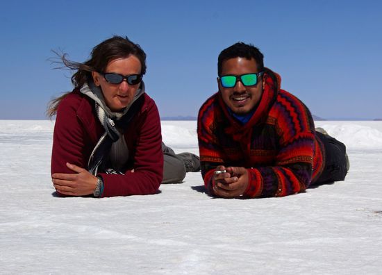 Nach dem Besuch der Insel spazieren wir noch ein wenig über der harten, trockenen weißen Salzkruste, machen Fotos und sind froh, dass das Salz nicht als Pulver durch den immer stärker werdenden Wind getragen wird.
