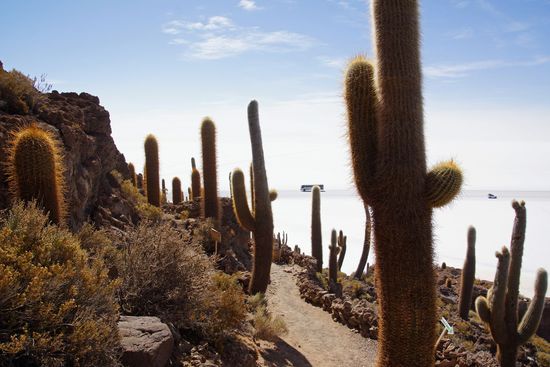 Nach dem Mittagessen fahren wir zu der Isla del Pescado, die wir gegen Eintritt besuchen und besteigen können. Es gibt einen schönen Rundweg, den man nehmen kann und so von verschiedenen Seiten einen tollen Blick auf den Salzsee hat. Die Autos und Busse, die wie auf dem Salzsee sehen, erscheinen winzig, wie Spielzeugautos. Die Kakteen dagegen sind monströs, teilweise mehrere Meter hoch. Ganz oben auf dem Aussichtspunkt pfeift der Wind Sehr heftig, da halten wir uns nicht so lange auf.