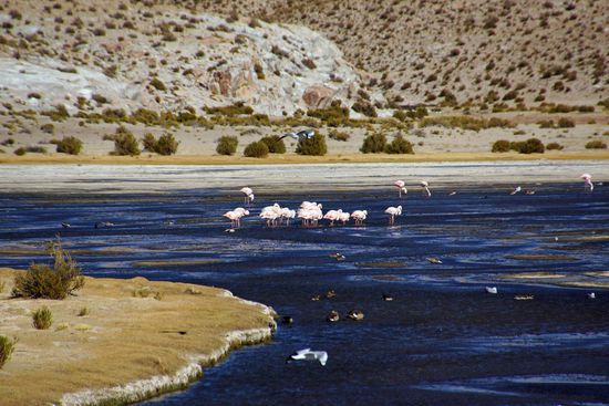 Irgendwann verfliegt wohl der Kater und Armandos Laune bessert sich, gottseidank! Wir fahren zur ersten Lagune, die auf unserer Tour geplant ist. Wir hüpfen aus dem Auto, schießen ein paar Fotos, versuchen, die Landschaft zu genießen, doch der stürmische Wind stört. Ich versuche, mit der Kamera die Flamingos zu erfassen, beeile mich aber, denn der Wind ist heftig. Keiner will wirklich lange draußen bleiben. Laut Wettervorhersage soll es im Laufe des Tages noch heftiger werden... .