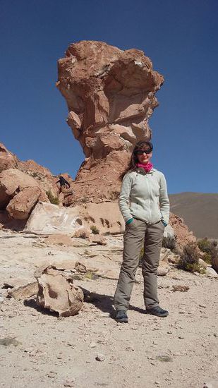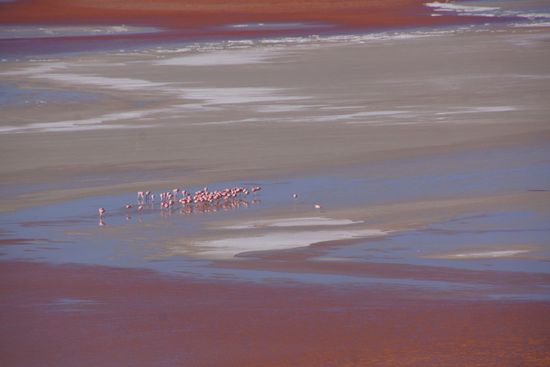 Am Nachmittag kommen wir an der wunderschönen Laguna Colorada an! Wir laufen bis zum Wasser und schauen uns das rote, aufgewühlte Wasser der Lagune an. Am Rande sitzen Möwen und kämpfen vermutlich ebenso mit dem Wind wie wir. Es ist ein irres Gefühl, der Wind peitscht uns in die Gesichter, und wir versuchen trotz des heftig kalten Winds das ganze zu geniessen. Ich habe im Auto meine Handschuhe vergessen und spüre meine Finger irgendwann nicht mehr... egal... noch ein bißchen will ich hier bleiben, es ist wirklich toll! Irgendwann kann ich nicht mehr vor Kälte und renne zurück zum Auto. Dort sitzt schon Luca, der ebenfalls keine Handschuhe anhatte. Wir jammern beide über den Schmerz in den Fingern, den wir jetzt spüren... .