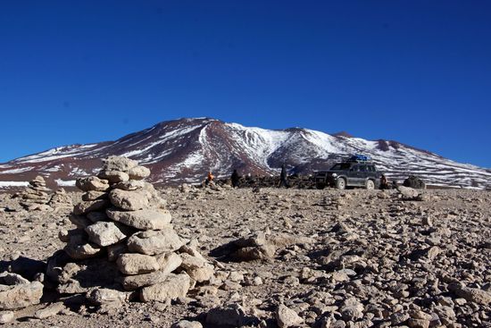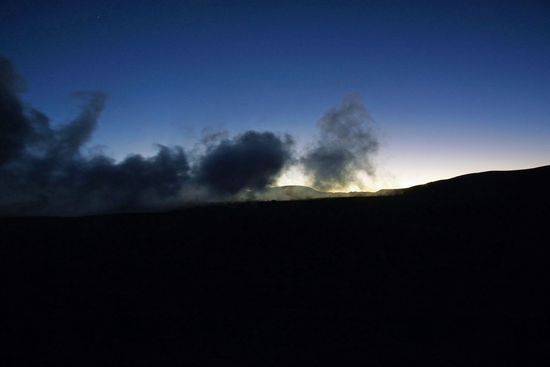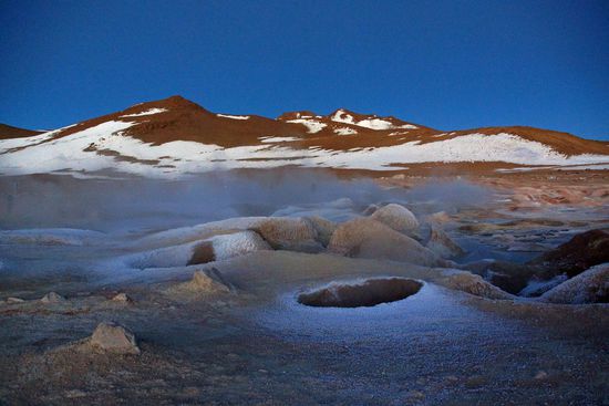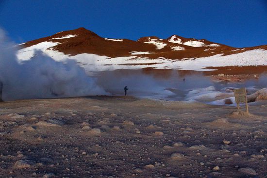 Um 4:30 werde ich wach. die erste Gruppe im Refugio frühstückt hinter der Wand. die Nacht war..... kalt, trotz aller unternommen Manahmen sich zu wärmen. Dennoch, irgendwann konnte ich schlafen. Wir stehen alle sechs gegen 5 Uhr auf, machen unsere Rucksäcke fertig und frühstücken. Kurz nach halb sechs fahren wir los zu den Geysiren. Die Sonne ist noch nicht aufgegangen und der nach Schwefel stinkendes Wasserdampf schießt aus den Erdlöchern und wird von dem Wind Richtung Sonnenaufgang bewegt - der Wind ist wieder da. Ich mache ein paar Fotos bis mir Carlos sagt, sein Daumen wird blau, und fragt mich, was das bedeutet... (seine ersten Erfahrungen mit der eisigen Kälte). Wir gehen schnell zum Auto, die anderen warten schon längst auf uns und wundern sich, dass wie so lange draußen durchhalten.