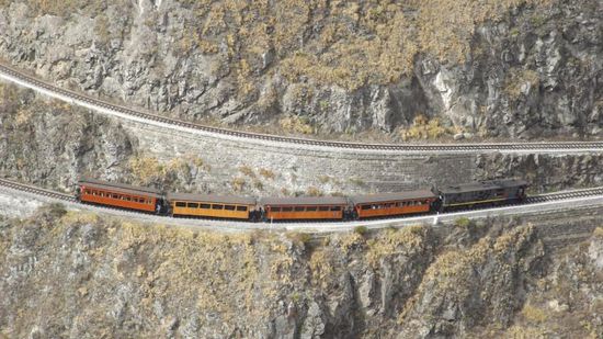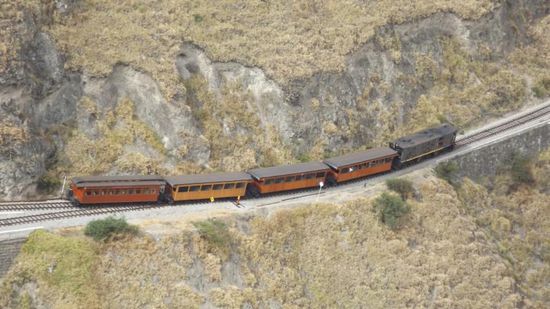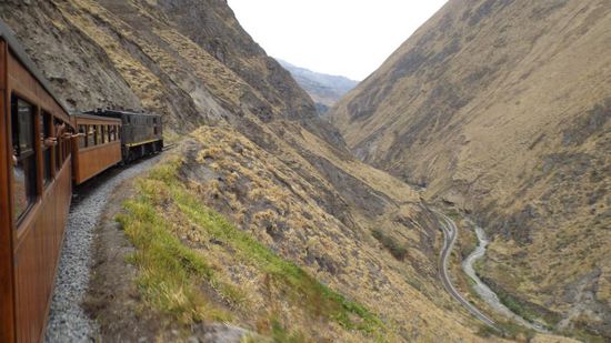und ein kleines Museum besucht werden darf. Noch schnell den im Fahrpreis enthaltenen Snack bestehend aus einem Glas Saft und einem 'Schinken-Käse-Sandwich' verzehrt und dann heisst es um 13:00 auch schon wieder 'Alles Einsteigen' zur Rückfahrt nach Alausi, das wir um 13:30 erreichen. Wir fahren weiter Richtung Süden und entdecken etwa 30 km weiter bei Pistishi, ein Hinweisschild zum Mirador Nariz de Diablo. Richtig, am Ende des Dorfes ein kleines neues Restaurant bei dem uns ein etwa 300m langer Weg bergab zu einem Aussichtspunkt genau gegenüber der Teufelsnase bringt.