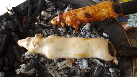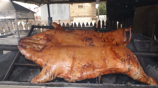 Nach einer mit 7º wie erwartet kühlen Nacht fahren wir zurück nach Cuenca und lernen dort am Strassenrand eine neue Art des Schweinegrillens kennen. Ähnlich wie wir es hier bei Hähnchen schon gesehen haben, wird das Tier der Länge nach aufgeschnitten, flachgedrückt und dann so am Drehspiess gegrillt.