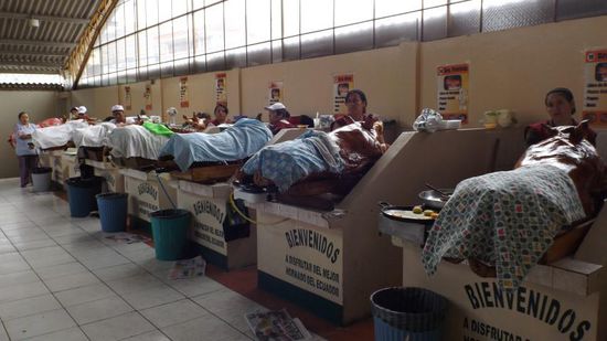 Hierdurch verringert sich die Grillzeit für ein ganzes Schwein auf ca. 3 Stunden - erscheint mir nachahmenswert. Unser Ziel für heute ist es, vier im Lonely Planet gelobte Sonntagsmärkte zu besuchen und dabei die lokalen Trachten etwas zu studieren. In Gualaceo kommen wir auf dem Markt an diesen, an eine Krankenstation erinnernden Ständen vorbei, wobei die Patienten unter den Tüchern aber ganze gegrillte Schweine sind,