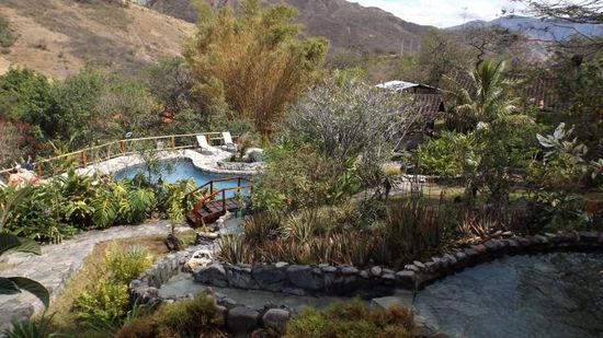 Alles in allem ein schön bunter Spät-Nachmittag. Wir fahren noch weiter bis Vilcabamba, wo wir im Hostal Izhcoyluma schon wieder so ein paradiesisches Plätzchen finden. Hier in einer tropischen Gartenanlage ein unter deutscher Leitung stehendes kleines Hotel mit Pool,