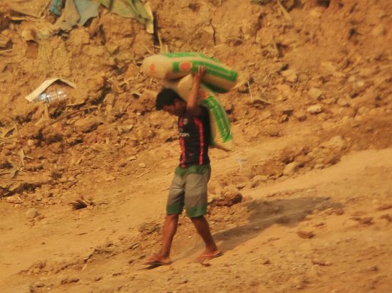 Ich bin jeden Tag im Hafen gewesen, habe mich umgeschaut, gefragt und verglichen. Der Verantwortliche der Barco hatte mir gesagt, dass das Schiff am Sonntagmorgen auslaufen wird. Als ich am Samstagmorgen nachfragen war, hieß es, wir starten in 5h. Also bin ich zurück ins Hostal, habe meine Sachen gepackt und los. Zu Mittag hieß es dann wieder, wir starten in 5h und irgendwann am Abend sagte man uns, sorry wir laufen Morgen aus. So habe ich meine erste Nacht in der Hängematte im Hafen verbracht. Das Moskitonetz konnte ich nicht so recht aufspannen, aber mit fünf Stichen bin ich gut davon gekommen und ich habe auch einigermaßen geschlafen. Es hat sich noch ein italienisches Pärchen zu mir und dem Franzosen gesellt. Zu viert läßt es sich besser auf die Sachen aufpassen.