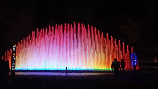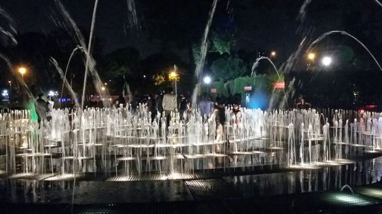 An einer Stelle sind viele Wasserfontänen in einer Kreisform angebracht. Sie bilden fünf Ringe um das Zentrum und die Ringe schießen zur bestimmten Zeit Wasser nach oben. Es gibt noch weitere Fontänen, die eine Art Sprühnebel verteilen, andere schießen Wasser vom äußeren bis zum innersten Ring. Die Kunst ist es, den richtigen Moment abzupassen, um von außen bis zur Mitte zu gelangen, wo es glücklicherweise trocken aber auch voller Menschen ist. Es ist rutschig, man muss aufpassen, nicht auszurutschen und sich doch nass zu machen. Die Leute, klein und groß, haben alle viel Spaß dabei.
