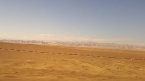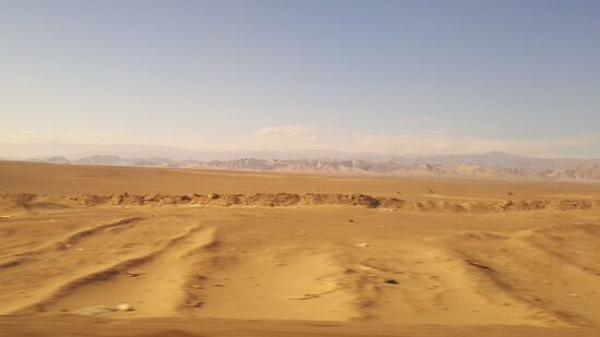 Landschaftsbild unverändert—immer noch zieht sich die Gebirgskette der Anden links der Straße, davor weiterhin Sandwüste oder bebautes Ackerland oder Dörfer.
