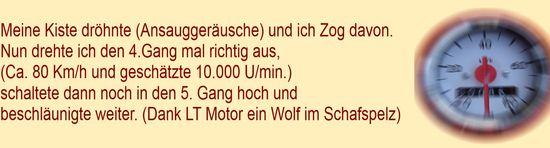 Er grüßte mit breitem Lächeln und tippte dabei mit Zeige- und Mittelfinger cool an den Helm. ... ich konnte mich nicht zurückhalten, schaltete in den 4 Gang zurück, und gab richtig Gas.