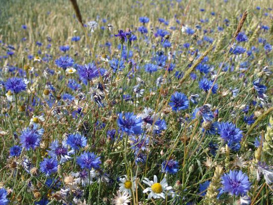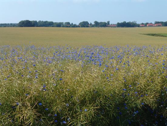 Auf der Hanse-Route 105 fahren wir durch Landwirtschafts-Gebiet. Die Kornfelder sind reif zum mähen und die Kartoffeln blühen in endlosen Reihen. Über Rostock erreichen wir die Hansestadt Stralsund, welche sich "das Tor" zu Deutschlands grösster Insel - Rügen nennt. Über die im Jahre 2007 eröffnete Rügenbrücke fahren wir auf die Insel. Ab Sassnitz führt uns die Touristenstrasse durch den Jasmund-Nationalpark und an typischen Inseldörfer vorbei bis nach Altenkirchen. Hier finden wir einen etwas teuren Stellplatz für die Nacht (Hochsaison Preis) (GPS N 54.38'18 O 13.22'35). Direkt am Platz beginnt ein schöner Wanderweg, der an der Steilküste entlang ins Fischerdorf Vitt führt. Hin und zurück sind 10 km angegeben, was gerade richtig für unsere sportliche Tätigkeit erscheint! Wie goldige Wellen wiegen sich die Kornfelder durchsetzt mit blauen Kornblumen im Wind. Im Fischerdorf Vitt machen wir nur kurz Halt, zünden 2 Kerzen in der Kapelle an und machen uns in der Abendsonne zurück auf den Heimweg.