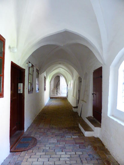 Wir haben Glück und eine Außentür ist offen, so dass wir einmal durch die Gänge 'schleichen' können, in denen es totenstill ist. Leider ist die Kirche verschlossen.
