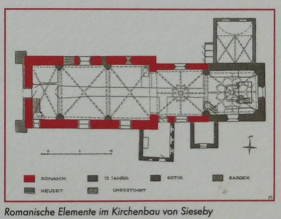 Das beherrschende Gebäude ist die Kirche. Sie blickt auf eine fast 800-jährige Geschichte zurück, und von ihrer Entstehung erzählt eine Sage: Als es in grauer Vorzeit einmal einen besonders harten Winter gab und die Umgebung von Sieseby tief verschneit war, schaute nur ein kleines Stückchen Erdboden in Gestalt des Kreuzes aus dem Schnee heraus. Dieses Wunder machte schnell die Runde. Die Mönche vom damaligen Bischofshof Stubbe fassten es als ein göttliches Zeichen auf, und die Kirche wurde just an dieser Stelle aufgebaut.