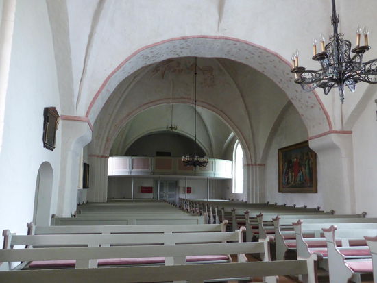 Um 1350 wurde ein neuer Chorraum nach Osten hin angebaut und das spätromanische Kreuzrippengewölbe eingebaut. In eine spätere Epoche fällt der Bau des wuchtigen Turmes, der aus gebrannten Steinen auf das bestehende Mauerwerk aufgesetzt wurde. Ein halbes Joch des überbauten Gewölbes ist im Vorraum mit der Treppe zum Glockenstuhl gut erkennbar. Die Zahl 1819 an der westlichen Außenwand des Turmes erinnert an eine große Renovierung der Kirche, die eine Verblendung des Turmes mit den beiden Eckpfeilern mit sich brachte. Außerdem wurde der Westeingang geschaffen, während die Türen sowie die hochgelegenen romanischen kleinen Fenster an der Nord-und Südwand zugemauert wurden. Damit endete die Sitte, durch die Nordtüre zur "Frauenseite" und durch die Südtüre zur "Männerseite" in die Kirche zu gelangen.