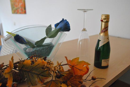 Dieses Mal ist die Überraschung positiv: eine tolle Wohnung. Sehr groß, das Bad und die Dusche sogar viel größer als bei mir daheim. Es gibt eine Waschmaschine (ich habe trotzdem nicht vor, sie zu benutzen) und eine Spülmaschine (auch meinen Teller und meine Tasse werde ich wohl von Hand abspülen). Und ganz liebevoll dekoriert ist eine Theke mit Konfekt und einem Piccolo zur Begrüßung. Der wird nun sofort von mir zum unterwegs gekauften Flammkuchen vernichtet und somit ist die Entspannung eingeläutet.