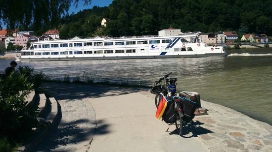 Momentan auf Flußniveau am Waldweg dahincruisend, begleitet mich das Ausflugsboot "MS Schärding". Bevor ich gewohnheitsgemäß hinüberwinken wollte, rief sogar ein Passagier zu mir herüber, ich solle doch mal rüberwinken. Dieser Aufforderung kam ich natürlich gerne nach.