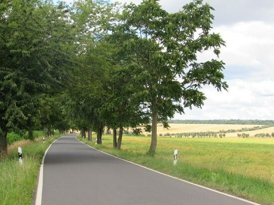 Angenehm abwechslungsreich geht es weiter. Mal Feldweg, dann kleine Wald Passagen und dann mal wieder Landstraßen mit Bäumen flankiert die uns von einem kleinen Dorf ins nächste führen.