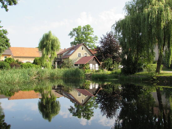 Hier in Kumschütz lebt Familie Wirtschas, die Herbergseltern. Wir werden im Schatten des Kirschbaumes mit Erdbeerkuchen und Kaffee freundlich empfangen.