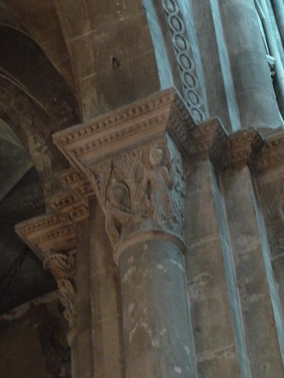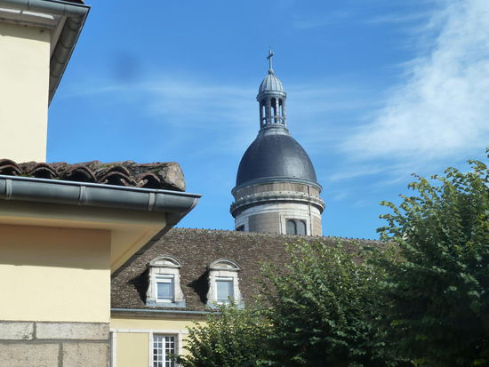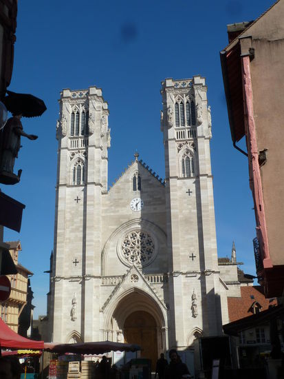 Am nächsten Morgen ist es total neblig - man sieht die Hand vor Augen kaum - so geht es auch der Meise, die permanent gegen unsere Schlafzimmerscheibe fliegt. Bis zu unserem Aufbruch lichtet es sich nur ein wenig, trotzdem fahren wir wieder auf die Isle Saint Laurent zum Parken, um den Sonntagsmarkt von Chalon zu besuchen. der am Place Saint Vincent an der Kathedrale beginnt mit tollen Ständen - wir haben extra gestern nicht zugeschlagen beim Einkauf, damit wir heute frische Sachen für die Wohnung kaufen können. Beeindruckend ist die Auswahl: Pilze aller Kategorien frisch gesammelt!, Brioche um einen Kegelstumpf gewickelt und gebacken - von uns irrtümlich für Pastetchen gehalten, Honig und natürlich Käse, Käse, Käse. Wir erstehen ein Entrecote, Schalotten, eine Pastetenscheibe (volaille), chevre frais und sec, Akazienhonig sowie ein Bouquet d'ail rosé für Doris.