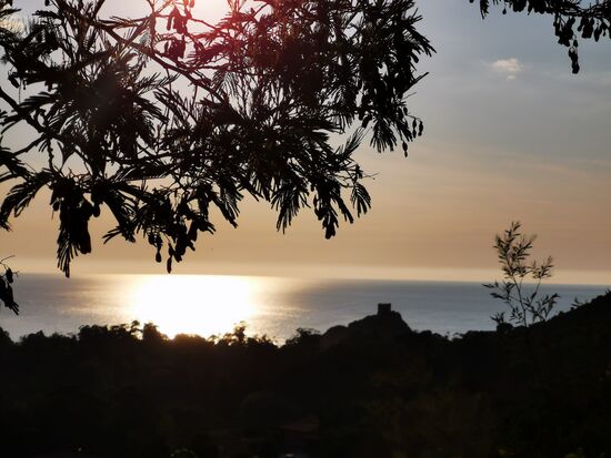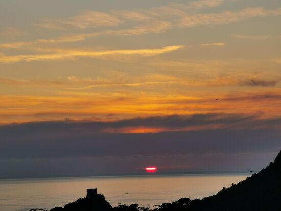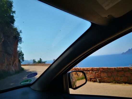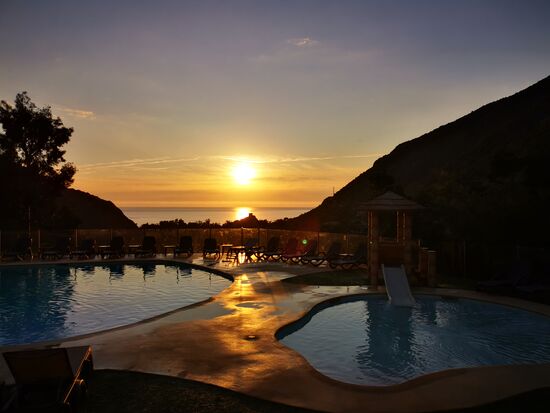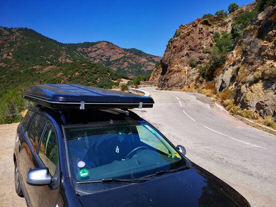 Der erste Platz, den ich anschaue: E Gradelle, Osani. Ach du Schreck. Zum Glück bin ich nicht hinein gefahren, sondern habe draußen geparkt und bin zu Fuß durch das Gelände gelaufen. Das ist ein totaler Bergplatz - ich weiß nicht, wie ich überhaupt hätte durchfahren können - Steigungen und Gefälle ...puuuuh. Und die wenigen ebenen Plätze sind belegt von kleinen Camping-Bussen. Also weiter. Nächstes Schild: Camping Sole e Vista Porto... Ich habe keine Lust weiter zu suchen und bleibe ... Luxus pur... vor allem der Preis. Der Spaß kostet mich 25,00 € ... ohne Strom - den cancel ich zugunsten wenigstens einem Platz mit Aussicht auf den Golf von Porto. Ich brauche aber weder den Fitnessplatz in vollem Sonnenschein, noch den überfüllten Swimmingpool. Egal ... morgen gleich weiter und neuen Platz suchen.