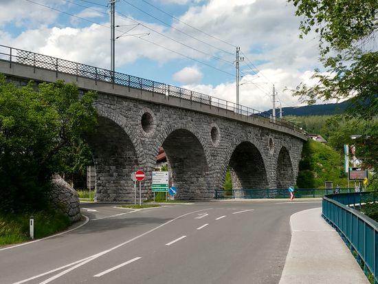 Das aus in der Umgebung gewonnenen Natursteinen gebaute Ehrwalder Eisenbahn-Viadukt mit seinen vier Bögen.