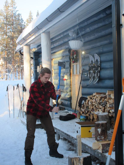 Unsere Unterkunft, die Aurora Cabin unmittelbar neben der Grenze zum Urho-Kekkonen Nationalpark bei Kakslauttanen südlich von Saariselkä war genau, was wir uns erhofft hatten. Ausgestattet mit zwei Saunen (einer elektronischen in der Hütte und einer mit Holz beheizten Fasssauna vor der Tür), einem Kamin und einem urgemütlichen Wohnzimmer hatten wir gleich das Gefühl, hier die richtige Wahl getroffen zu haben. Fünf der elf Nächte würden wir hier verbringen und die Aussicht auf einen heißen Saunagang nach dem anderen, nachdem wir den Tag draußen in der klirrenden Kälte verbracht hätten, ließ Vorfreude aufkommen.