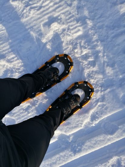 Am ersten Morgen ließen wir es erst einmal ruhig angehen, kochten Kaffee und aßen, was wir aus Deutschland mitgenommen hatten. Dann aber lockten das herrliche Wetter und die unberührte Natur direkt vor unserem Fenster doch zu sehr um zu lange untätig zu bleiben. Und so drehten wir eine erste Runde mit den Schneeschuhen. Da zwei von uns vieren noch keine Erfahrung mit Schneeschuhwanderungen hatte, war das auch eine Art Jungfernflug, der jedoch grandios fehlschlug: Es wurden zwei Schneestockteller verloren und wir wären fast in einen Bach gestürzt, weil ich das Eis für dicker hielt, als es tatsächlich war. Es wäre zwar nichts passiert, aber die Erkenntnis, dass auch bei -15°C ein Bach nicht unbedingt dick genug vereist ist, um auf ihm zu stehen, blieb fortan in unseren Köpfen.