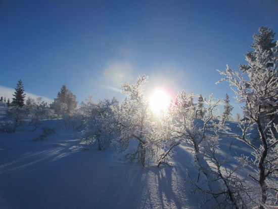 Heute sollte es also richtig losgehen. Wir fuhren von unserer Hütte etwa zwei Kilometer weiter nach Osten zum Kiilopää Fjellcenter, einem kleinen familiären Wintersportzentrum, das hauptsächlich als Ausgangspunkt für Langlauftouren genutzt wird. Wir allerdings wollten von hier aus unsere erste echte Schneeschuhtour starten. Die Temperaturen waren an diesem Morgen auf -20°C gefallen, was aber mit der richtigen Kleidung und Bewegung keineswegs unangenehm war. Überhaupt sind die gefühlten Temperaturen nicht mit denen in Deutschland zu vergleichen, da die Luftfeuchtigkeit meistens deutlich geringer ist, was dafür sorgt, dass auch zweistellige Minusgrade gut auszuhalten sind.