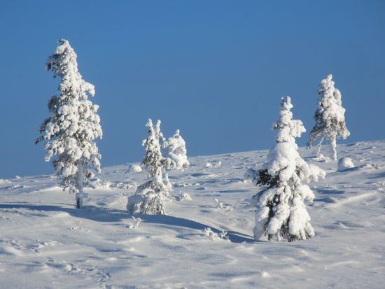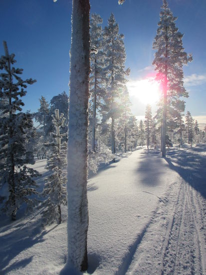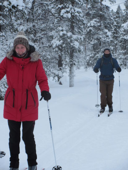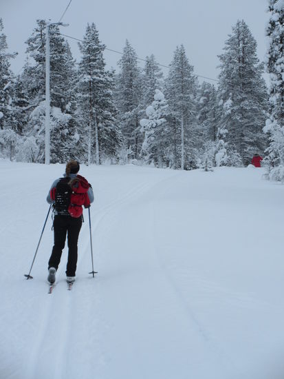 ... denn am nächsten Morgen hatten wir etwas geplant, das ein weiteres Novum für uns alle darstellte: Langlaufen. Zwar bevorzuge ich das freie Laufen (ob im Winter mit Schneeschuhen oder im Sommer ohne), da so einfach mehr das Gefühl von Freiheit aufkommen - gerade hier in den großen Weiten des nördlichen Lapplands - allerdings konnten wir nicht anders, als zumindest ein Mal jenen Sport auszuprobieren, wegen dem die meisten Finnen zu dieser Jahreszeit in den Norden reisen. Hier war die demographische Aufteilung unter den Touristen besonders stark zu sehen, denn außer uns waren kaum Ausländer zu sehen. Die langlaufenden Finnen jedoch waren stark durchmischt: vom 50-Kilo-Marathon-Asketen bis zur beleibten isoäiti (Großmutter) war alles zu finden. Wir befanden uns wie immer irgendwo dazwischen, körperlich nicht ganz ungeschickt, doch reichlich unerfahren auf den langen Latten.
