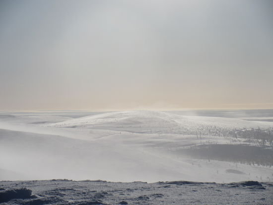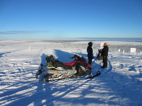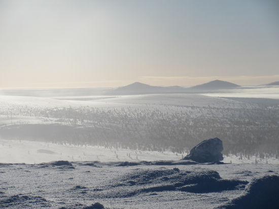 Unsere Tour führte uns auf den namensgebenden Hügel Kiilopää. Das schöne in Lappland ist, dass es keine besonders hohen Berge braucht, um über die Baumgrenze hinaus zu kommen. Oftmals liegen die Täler noch in dichtem Wald, doch bereits in 100 Metern höherer Lage wachsen nur noch zwergige Sträucher und Büsche, die im Februar natürlich unter einer dicken Schneedecke begraben sind. In Finnland unterscheidet man daher zwischen den sog. ‚tunturi‘ und den ‚vaara‘, wobei erstere Hügel ohne und letztere Hügel mit bewuchs am höchsten Punkt beschreiben. Der Ausdruck ‚pää‘ bedeutet Kopf und ist grundsätzlich für alle Arten von Erhebungen zu benutzen. Wir stiegen ca. 300 Höhenmeter auf die Spitze des Hügels und hatten einen herrlichen Blick über die Weiten des Umlandes. In Richtung Osten konnte man bereits die 30km entfernte russische Seite erahnen und an klareren Tagen hätte man in Richtung Nordwesten sogar bis nach Nordnorwegen blicken können. Ein jeder Bergsteiger weiß, dass man nicht zu lange auf dem Gipfel verweilen sollte, um sich in seinem verschwitzten Zustand nicht zu erkälten. Diese Regel galt für uns bei den gegebenen Temperaturen natürlich umso mehr, weshalb wir uns rasch wieder an den Abstieg machten. Abgesehen von der tollen Aussicht, hat das winterliche Bergsteigen einen weiteren Vorteil gegenüber dem Laufen im Tal: der Schnee ist weniger als halb so tief wie in den Senken. Während wir uns in den Niederungen gehörig anstrengen mussten, um einen Fuß vor den anderen zu bekommen, hätten wir weiter oben sogar ganz auf die Schneeschuhe verzichten können. Aus diesem Grund stelle ich mir eine winterliche Höhentour etwa über die langgezogenen aber abgerundeten Berge Norwegens sehr toll vor.