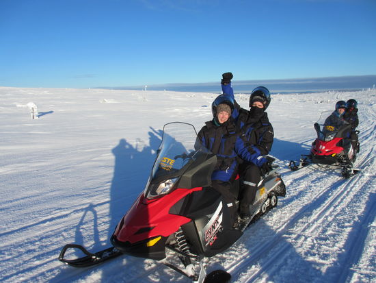 Wir fuhren gleich vor unserer Hütte los, immer zu zweit auf einem Schneemobil. Anfangs hatte mich das noch etwas geärgert, doch schnell wurde mir klar, dass das für Anfänger wir uns eine gute Entscheidung war: Es war noch einmal kälter geworden und das Thermometer stand mittlerweile bei -20°C, sodass einem trotz Lenkerheizung schnell die Finger wegfroren. Ansonsten war es sehr angenehm, denn der Fahrer konnte stets seine Beine in Aussparungen stecken, aus denen einen die Moterwärme auf Temperatur hielt. Insofern war es zumeist eher der hinten sitzende, der sich über die Kälte beklagte.