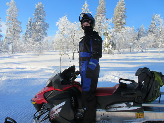 Heute entschlossen sich meine Freundin und ich für eine spontane Schneemobiltour. Unser Gastgeber Henry, der offenbar von den Einnahmen aus gleich einem halben Dutzend Jobs lebt, hatte uns angeboten eine Schneemobiltour mit uns zu machen. Da ich während meiner bisherigen Reisen in den Norden als Student nie das nötige Kleingeld in der Tasche hatte, konnte ich mir diesen Spaß bisher nie leisten. Eine drei Stunden Tour kostete bei Henry und seinem Partner 120€ pro Person, bei größeren Veranstaltern etwa in Rovaniemi aber auch hier in Saariselkä ist man locker bei 150€ bis 200€ und fährt in 30-Mann-Kolonnen über langweilige zugefroren Flüsse. Hier hatten wir glücklicherweise nur ein weiteres französisches Paar dabei.