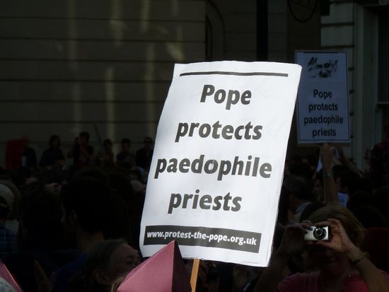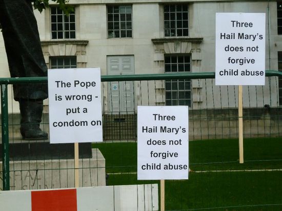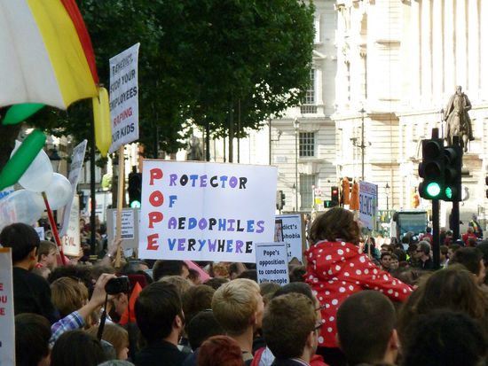 Vom Camden market ging es in Richtung Westminster, dort wo sich Westminster Abbey, Big Ben und das "Regierungsviertel etc. befindet. Dort angekommen, sind wir erst mal wieder in ne Demonstration reingelatscht (siehe unser Thailandbericht...). Vor der Downing Str. No. 10 oder sagen wir mal vor dem Tor zur Einfahrt in die Downing Str., standen einige Hundert Demonstranten, die unseren Joseph Ratzinger bzw. die Politik des Vatikans in Sachen Kindesmissbrauch durch Kirchenangehörige, gar nicht so toll finden....
