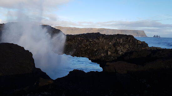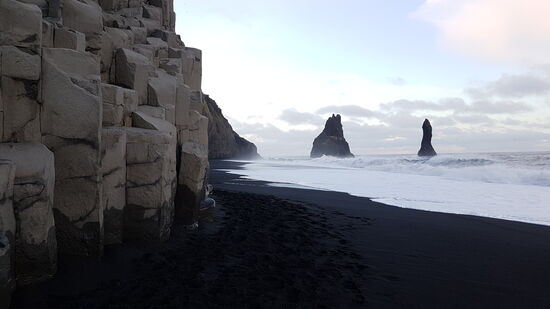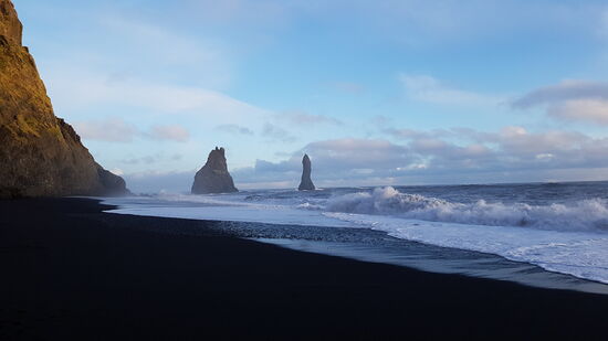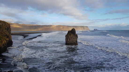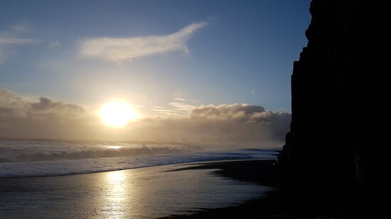 Im Anschluss ging es weiter nach Vik, wo wir aufgrund des guten Wetters auch direkt noch einen Stopp auf der Halbinsel Dyrholaey sowie dem Strand Fjallsarlon Beach gemacht haben. Letzterer war von Touristen sowas von überlaufen, dass leider kein wirklich schönes Bild von den Basaltsäulen möglich war. Wir wollen morgen Früh nochmal unser Glück versuchen und hoffen, dass es dann noch nicht ganz so voll ist. Beim Dyrholaey gibt es zwei verschiedene Aussichtspunkte. Einer davon (auf dem Plateau auf dem auch der berühmte Leuchtturm steht – hier muss man an der Abzweigung rechts fahren) ist jedoch nur mit 4x4 zu erreichen, deswegen mussten wir den anderen wählen (linke Abzweigung). Hier hat man aber ebenfalls eine tolle Aussicht, vor allem auch auf die großen Wellen die sich direkt vor einem am Felsen brechen. Wir überlegen, ob wir morgen nochmal wiederkommen und von diesem Aussichtspunkt aus zum anderen Aussichtspunkt am Leuchtturm hochlaufen. Von dort sieht man dann wohl auch den bekannten Steinbogen.