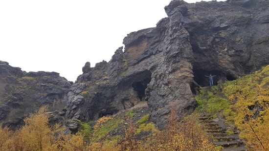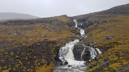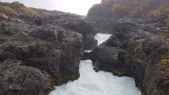 Im Anschluss haben wir noch einen kleinen Umweg gemacht und einen Abstecher zu den direkt nebeneinander liegenden Wasserfällen Hraunafoss und Barnafoss gemacht, wobei der erste der sehenswertere ist. Wir hatten sogar Glück und die Sonne hat kurz raus gespitzt. Zuvor hat es allerdings in Strömen geregnet und wir waren entsprechend durchnässt und durchgefroren.