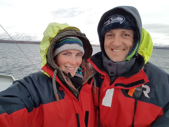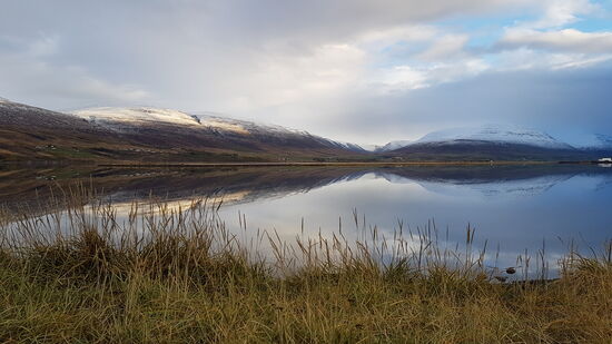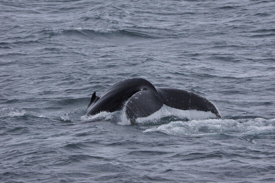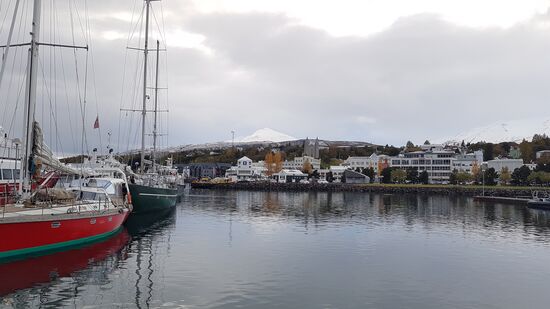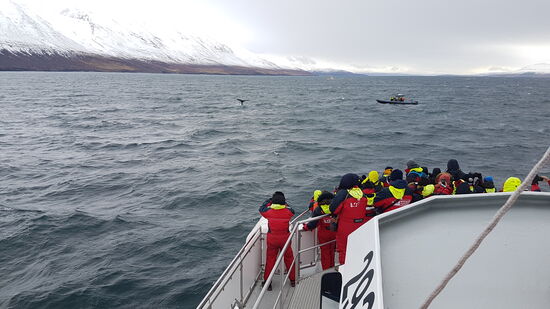 Der heutige Tag startete mit Regen und auf dem Weg nach Akureyri muss man über einige Berge fahren, wo wir von heftigem Schneefall überrascht wurden. Da wird einem schon anders im Mietwagen mit Sommerreifen. Wir hatten Glück, in unsere Richtung ging es meistens bergab, die entgegenkommenden Mietwägen hatten am Berg schon mächtig Probleme und sind ordentlich weg gerutscht oder konnten teilweise kaum mehr anfahren. Ein Auto haben wir sogar im Straßengraben entdeckt, zum Glück ist den Insassen nichts passiert und der Abschlepper war bereits informiert. Wir waren jedenfalls sehr froh, als wir in Akureyri heil angekommen sind. Wir hatten am Morgen noch spontan eine whale watching Tour gebucht. Die deutlich teurere 2-stündige Tour mit dem Speedboot kam für uns nicht infrage (wegen Schwangerschaft), deswegen haben wir die 3-stündige Tour auf einem größeren Boot gebucht. Etwas verwirrend war, dass das Büro zwar direkt am Wasser lag, wir aber erst mal 20 Minuten mit dem Bus in einen Hafen weiter nördlich gebracht wurden, von dort ging es dann los, ca. 3 Stunden waren wir auf dem Wasser unterwegs. Auf dem Boot haben wir uns direkt einen Überlebens-Anzug geschnappt, weil wir die komplette Fahrt außen verbringen wollten. Man hätte bei diesem Boot auch innen sitzen und sich an der Bar heiße Getränke kaufen können. Wir haben bei diesem Ausflug einen Buckelwal gesehen und auf dem Rückweg einen Minkwal (den wir selbst leider verpasst haben) und ein paar Schweinswale. Der Buckelwal war immer eine Weile an der Wasseroberfläche, hat dann seine Schwanzflosse aus dem Wasser geworfen und ist abgetaucht. Danach ist er meist 5-10 Minuten unter Wasser verschwunden und wir haben gewartet, bis er wieder auftaucht. Auf jeden Fall ein toller Ausflug an einem ansonsten bis dahin sehr verregneten Tag. Wieder etwas verwirrend war, dass es auf der Rückfahrt nicht mehr zum Busstop ging, sondern direkt in den Hafen nach Akureyri, der Rückweg war also deutlich länger. Da wir das nicht wussten, hatten wir unsere Anzüge zu früh ausgezogen und sind nach innen umgezogen, deswegen haben wir leider auch den Minkwal verpasst. Etwas ärgerlich, aber vermutlich hatten wir uns einfach nicht ausreichend über den Ablauf informiert.