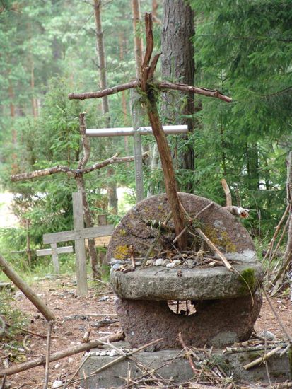 Auf dem Weiterweg machen wir Halt bei einem merkwürdigen Ort, dem Kreuzberg, oder auf Estnisch, Ristimägi. Zwar ist er kein Vergleich zu dem berühmten Berg der Kreuze in Litauen, doch umgibt auch diesen Ort eine mystische Atmosphäre. Tausende Kreuze verschiedener Grössen, allesamt aus Naturmaterialien geschaffen, stehen oder liegen entlang einem kleinen Waldweg. In der Tat erinnert er an ein trauriges Kapitel der Inselgeschichte, die Deportation der hier zuvor ansässigen Schweden. Ein Erlass Katharinas II. hatte zu der Zwangsdeportation der schwedischen Bevölkerung geführt. An dieser Stelle sollen sie zum letzten Mal einen Gottesdienst abgehalten und den Ort mit einem Kreuz markiert haben. In Gedenken an die Verbannten stellten Inselbewohner und Besucher im Laufe der Zeit immer mehr Kreuze auf. Auch Touristen sind eingeladen, ein Kreuz aus Naturmaterialien zu hinterlassen. Zweige, Kieselsteine und Tannenzapfen stehen in Hülle und Fülle zur Verfügung. Also basteln auch wir ein kleines Kreuz und stellen es zu den übrigen.