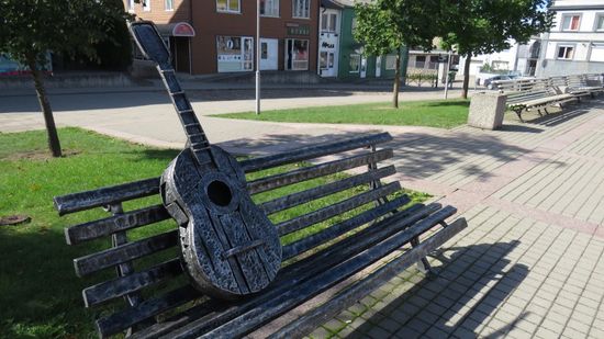 und die Bank mit Gitarre, die den lokalen Künstlern gewidmet ist.