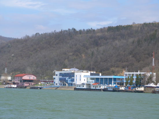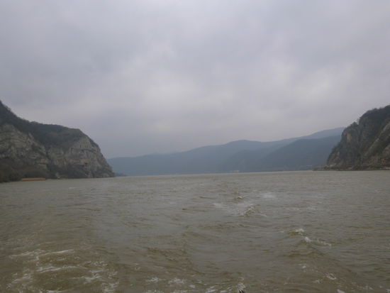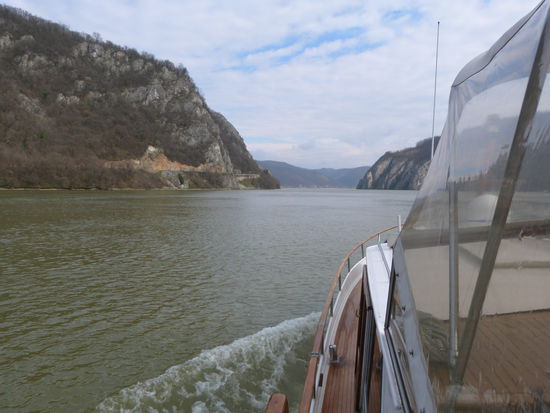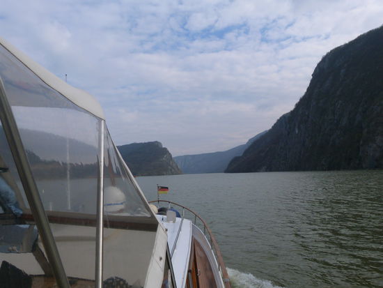Der Wind schläft nicht ein. Im Gegenteil, morgens wird er noch stärker. Es so bedauerlich, dass es diesig und unsichtig ist, gerade hier in dieser grandiosen Kulisse. Als wir die 1000 km Marke knacken, kommt auch die Sonne ein bisschen hervor. Jetzt zwängen sich die gewaltigen Wassermassen des Flusses durch eine Enge von nur 150 m. Wer denkt, dass das Wasser da hindurchschießen würde, der irrt. Der Starkwind Koschowa, er ist ein örtlicher Wind, wie der Mistral an der Rhone, lässt das Boot auf den Wellen tanzen und die Strudel im Wasser tun das Ihrige dazu. In Orsova versuchen wir einzuklarieren, obwohl wir ja angeblich in Serbien nicht ausklarieren konnten. Wir steuern den Ponton der Policia an, doch sie verweisen uns auf ein weißes Haus am genüberliegenden Ufer. Als wir anlegen kommt gleich ein junger Beamter und nimmt mich mit. Der serbische Stempel auf den Papieren scheint ihm zu reichen. Das Gebäude ist sehr jung und modern, im Erdgeschoss ist ein Fließband für Koffer, wie in einem Flughafen-Terminal, so ähnlich sieht auch die Empfangshalle aus. Erst marschieren wir drei Treppen rauf in ein völlig überhitztes Büro, dann wieder runter in ein Büro zur Ausländerbehörde. Die Dame die dort in Uniform sitzt trägt einen dicken Pullover, neben ihr bläst ein Heizöfchen und zusätzlich zu der Zentralheizung steht auch noch ein Elektro-Radiator da, der Hitze abgibt. Mir treibst den Schweiß aus allen Poren und ich habs wirklich gerne warm. 12 Euro werde ich hier los, dann marschieren wir ein Gebäude weiter zum Hafenkapitän. Er ist mit einer Crew-Liste zufrieden und will wissen, wie lange wir hier bleiben. Gar nicht sage ich ihm, wir wollen gleich nach dem Check in weiter. Das geht nicht, es hat 8 Bft. vor der Schleuse, sie arbeitet nicht. Gut, dann soll er uns einen Ponton zuweisen. Das bringt ihn in Schwierigkeiten. Am Zollponton können wir nicht liegen bleiben und sonst gibt’s hier nichts. Er sucht mit dem Fernglas die Ränder des kleinen Sees ab. Ohne Erfolg. Wir werden keinesfalls ankern bei diesem Sturm, erkläre ich ihm. Dann telefoniert er mit der Schleuse. Sie arbeiten wieder, also sollen wir los.