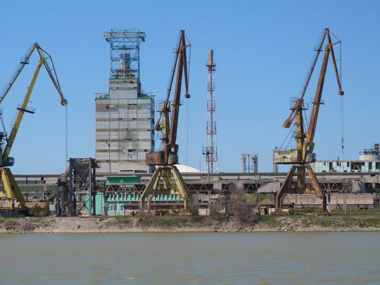 Drei Kräne, die ihre Jugendzeit lange hinter sich haben, künden den Beginn von Silistra an. Sie ist die letzte Stadt in Bulgarien, an der wir vorbeischippern. Ab km 375 fahren wir nur noch in Rumänien.