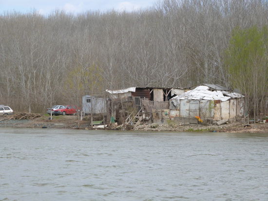 Wieder schleichen wir uns auf der Suche nach einem Nachtplatz in ein sehr schmales Ärmchen. Hier ist es mir eigentlich nicht recht wohl. Die Behausungen am Ufer sind unheimlich ärmlich und ungepflegt. Nachen liegen am Ufer, mit denen wäre es nur zwei Schläge mit den Rudern und schon bekämen wir Besuch. Unrat liegt auf der Uferböschung, ein Pony-Wagen klappert über die Straße, eine Kuh-Herde kommt anmarschiert, auf einer Straßenlaterne brütet ein Storch. Es ist unsere letzte Nacht auf der Donau. Unsere letzte Nacht vor Anker.