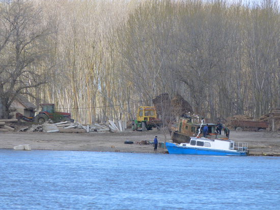 Der Fluss gebärdet sich mittlerweile so wild, dass Manfred in Erwägung zieht in den Bala-Kanal abzubiegen, der nach 10 km in den Borcea-Arm mündet. Doch Verberghts Karten zeigen viele Begegnungsverbote und Engstellen in dem Arm. Also scheint er ziemlich schmal zu sein. Würden wir einem Frachter auflaufen, könnten wir wahrscheinlich nicht überholen und würden vielleicht mit 2 km/h hinter ihm her trotteln. Darauf können wir auch verzichten. Also weiter auf dem Fluss. Nurt zwei Kilometer weiter ist ein Bagger dabei ein Leitwerk vor die Insel Epusarul zu legen. Anscheinend hat das letzte Donau-Hochwasser hier schwer gewütet. Die Bäume auf der großen Insel sind alle kahl, tot oder krank. Viele hat die Donau bereits entwurzelt, an der Abholzung des verbliebenen Restes arbeiten sie auch schon.