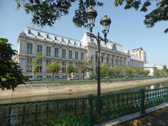 Entlang des nördlichen Ufers der Dambovita entlanglaufend sieht man am gegenüberliegenden Ufer den Justizpalast.