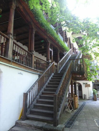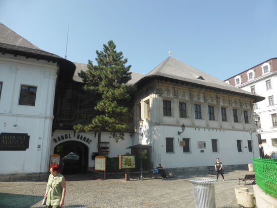 Obergeschoss. Die architektonischen Details wie Holzpfosten, Holzarchitrave und Bogen weisen auf die enge Verbindung von Klosterbaukunst, Stadtarchitektur und Volkskunst hin. Heute bieten mehrere Gastronomiebetriebe, ein Restaurant, eine Brasserie und ein Sommerlokal den Besuchern ein wenig Alt-Bukarester Flair. Ein historisches Ereignis fand hier auch statt: Im Jahr 1812 wurde im Hanul lui Manuc der Friedensschluß Russlands und der Türkei besiegelt.