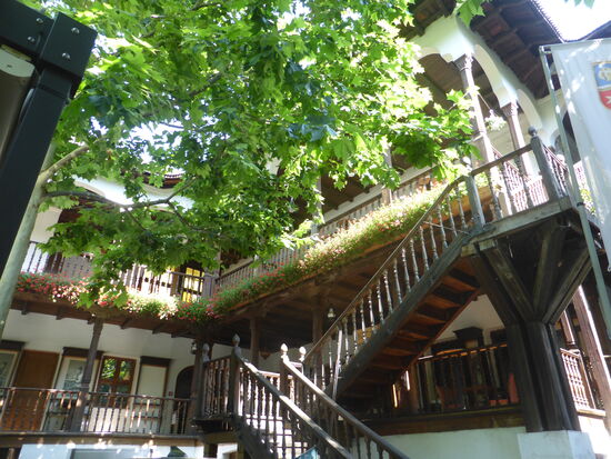 Das Gebäude umschließt einen rechteckigen Hof mit Laufgängen in Erd- und