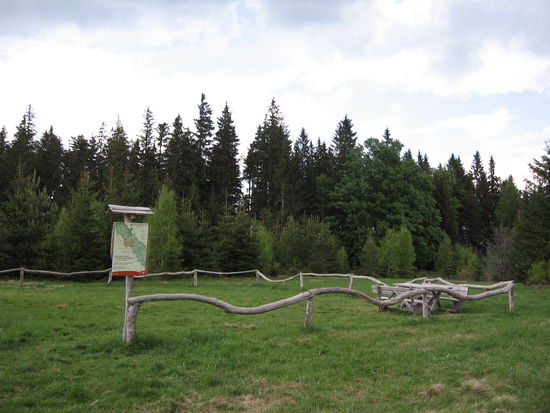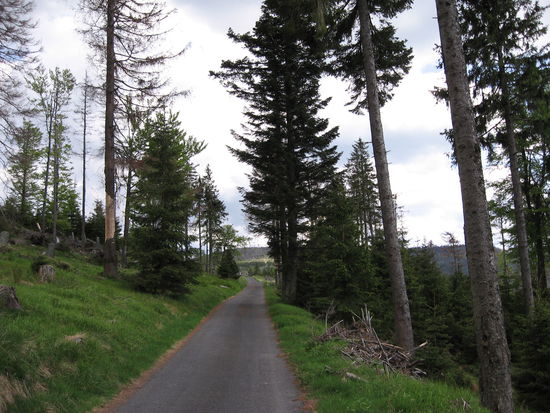 Und ganz oben - ein Schild zeigt 1122 m Meereshöhe - radeln wir auf ebenen Wegen mit leichtem Rückenwind durch Wiesen, deren erstes Frühlingsgrün erst wenige Tage alt sein kann. Die Berge um uns herum sind schon fast auf Augenhöhe: der Polom 1295 m, Plesna 1337 m, Zdanidla 1308 m, etwas weiter südöstlich der Polednik mit 1315 Metern, dort rauf soll sogar ein Radweg führen. Doch von der Paßhöhe führen alle Wege nun bergab. Jetzt wissen wir die fabelhaft asphaltierten Radwege zu schätzen, auf denen wir uns flugs herabrollen lassen können, bei Tempo 50 und mehr müssen wir Energie verschwenden und leicht bremsen.