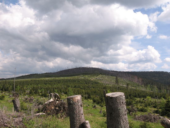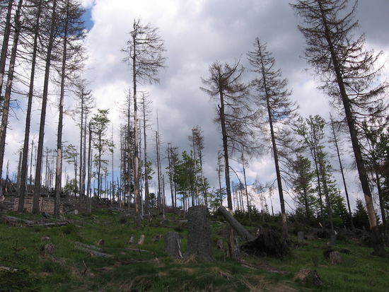 Nicht, weil's zu kalt ist, sondern weil Umweltschäden oder Borkenkäfer den Wald kahlgefressen haben. Die Baumleichen ragen in den Himmel und am Wegesrand sind überall Duftfallen für die Borkenkäfer aufgestellt