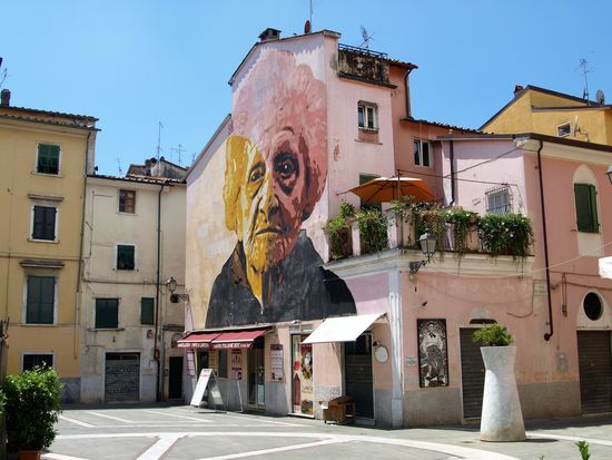 Carrara! Nochmal, und jetzt endlich auch das Centro, denn das hatte bei der Durchfahrt zu unserer Steinbruchbesichtigung interessant ausgesehen. Während Baedeker dieser Stadt nur eine halbe Seite widmet, lässt er sich über Lucca seitenlang aus. Dieses Ungleichgewicht irritiert uns, und wir wollen verifizieren, ob es sich tatsächlich so verhält. Eindeutig nein! Diese Ungerechtigkeit gehört ausgebügelt, und so ziehen wir durch die zwar heiße, aber wunderbare historische Innenstadt von Platz zu Platz. Es ist sehr entspannt, wenig los, weil Siesta, und es findet sich immer irgendwo eine schattige kühle Marmorbank. Natürlich muss ich auch wieder etwas kaufen und gebe mein ganzes Geld, was für den Tag vorgesehen war, für eine Kette mit Fischen aus. Diese bekomme ich aber auch allerliebst eingepackt: Es werden Blätter draufgetackert, ein Glückskäfer aufgeklebt, und zum Schluss das Ganze mit Erdbeerduft parfümiert!