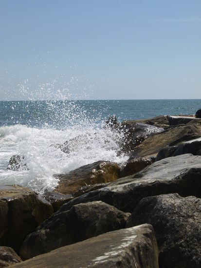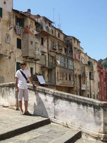 Und weil es auf dem Rückweg liegt und wir nach Abkühlung lechzen, besuchen wir unseren Badeplatz auf den Marmorfelsen. Die Wellen tragen heute Schaumkronen, es donnert im Gebirge, und die Wolken haben bizarre, fotogene Formen. Es sind wieder dieselben älteren Männer dort, die palavern und sich mit „ a domani“ verabschieden.