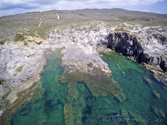 Das Wetter besserte sich und das Wasser leuchtete türkis zwischen den verwitterten Felsen. Wir blieben hier noch ein Weilchen. Später genossen wir noch am naturbelassenen Strand Portixeddu Accuau mit großen Kieselsteinen die herrlichen Sonnenstrahlen. Als wir abends durch die Stadt Sant‘ Antioco schlenderten und eine Ape fotografieren wollten kam der gut gelaunte Besitzer auf uns zu und wollte, dass Bernhard den Schlüssel nimmt und eine Runde damit dreht. Das fremde Fahrzeug wollten wir aber nicht in der Stadt fahren und so landeten wir hinten drauf und der Sarde fuhr mit uns eine Stadtrunde. Er düste ganz schön. Er und wir hatten sehr viel Spaß. Danach haben wir ihn auf ein Glas Wein im Café eingeladen und gab deswegen seiner Frau daheim Bescheid, dass er später kommt. Danach wanderten wir zur nächsten Bar Rex 13 beim Brunnen. Wir bestellten nur Getränke und bekamen eine wahnsinnig große Snackplatte gratis dazu. Abendessen gab es in der Pizzeria Renzo e Rita. Wir schliefen am Strand Coaquaddus und hörten die Wellen brechen.